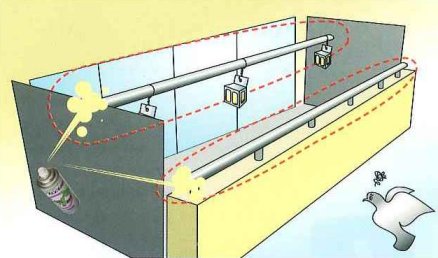 ハトは手すりや間仕切り壁の上に止まる事が多いので集中的にスプレーして下さい。